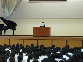 連休明け、生徒朝会がありました。今日は、先日、一年生が行った校外学習の報告がありました。代表の生徒がやや緊張しながらも一生懸命報告する姿が初々しく印象的でした。