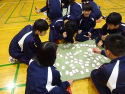 3年学活では、百人一首の練習です。下の句が読みだされると手が動くかるた状態です。記憶を呼び戻し、上の句でスパっと取れるように練習しましょう。