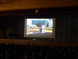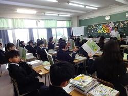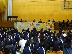 平和教育として、横浜夢座をお招きして朗読劇を視聴しました。時折たたかれる太鼓の音が戦争の怖さを連想させ、聞き入っていました。本来は11月に実施予定でしたが、インフルエンザにより学級閉鎖が続いていたため延期されていました。