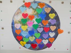 写真は「こんな世界をつくっていきたい」という思いを込めて生徒がメッセージを書き、作成した未来の地球です。