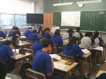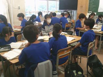 2年生の国語では、教育実習生による研究授業が行われました。「あ、射たり。」という人もあり、また。「情けなし。」と言う者もあり。誰がどのような気持ちで言ったのかを考え、平家と源氏の見方・考え方の違いについて考えを深めるという興味深い授業でした。個人やグループでしっかりと考え、時代背景を理解しながら、平家と源氏の心情の違いについて理解することができていました。違いについては山中2年生に尋ねてください。