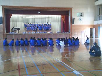 2年5組は、「友~旅立ちの時~」を歌います。「確かな答えなんて何一つ無い旅さ 心揺れて迷う時も ためらう気持ちそれでも 支えてくれる声が 気付けば いつもそばに 友」何が正解か分からない人生で悩んでいる中学生へ、そういう時こそ誰かに頼ることが大切だということを5組の合唱で表現してほしいと思います。交流会では、3年生の「海の匂い」を聞かせてもらいました。さすが山内中最高学年!2年生にとって刺激になる素晴らしい歌声でした。