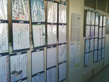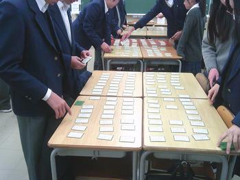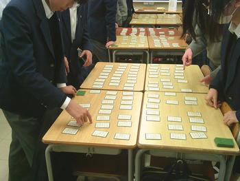 3年生では、百人一首をしていました。さすが3年生、上の句で札をとれる生徒が多いです。百人一首や決まり字を覚えていない生徒は、スピードでカバーしようと頑張っていました。廊下には、自分たちで作成した上の句の札のような作品が展示されています。現代語訳と雑学等が記載されています。保護者の方には、面談の際にご覧いただければと思います。