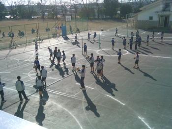 1年生では、サッカーやバレーボールを行っています。サッカーでは、ドリブルリレーをしていました。バレーボールでは、サーブ練習やスパイク練習をしていました。ドリブルリレーで勝ったチームを拍手でたたえたり、バレーボールの見本の生徒が成功したときに拍手したりするなど、温かい雰囲気で活動していました。