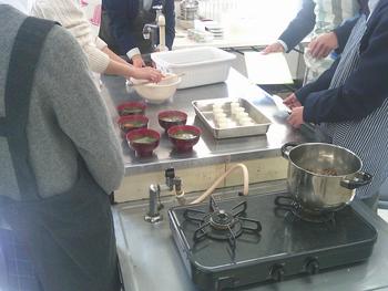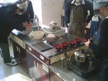 2年生の家庭科では、調理実習でお雑煮を作りました。盛り付けや洗い物などを分担しながら、小グループで協力して実習を行っていました。自分で作ったお雑煮を「少し味が薄い。」「餅がモチモチしている。」など言いながら、楽しそうに食べていました。家でも復習できるとよいのではと思いました。