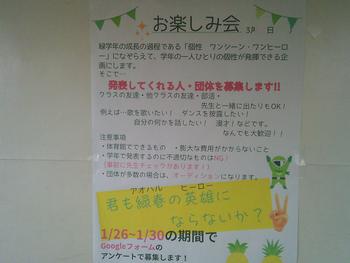 1年生では、お楽しみ会で発表してくれる人や団体を募集しています。例えば、歌を歌いたい、ダンスを披露したい、漫才をしたいなど、個性を発揮できる内容となっています。お楽しみ会が楽しみです。