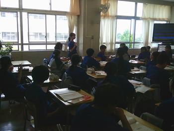 1年生の英語では、自己紹介を行っていました。名前やニックネーム、好きなもの等について英語で伝えあっていました。12歳twelve years old 13歳thirteen years oldは、発音しづらいですが、頑張って練習してほしいと思います。ペアで仲良く練習した後、みんなの前で発表したい人がたくさんいて、感動しました。