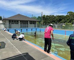 水泳の授業を目前に、プールのヤゴの救出活動を行いました。水位を下げて1時間程度の活動でしたが、100匹ほどのヤゴを捕まえることができました。救出したヤゴは、体育館横の蓮の池に放しました。トンボになるのが楽しみです。
