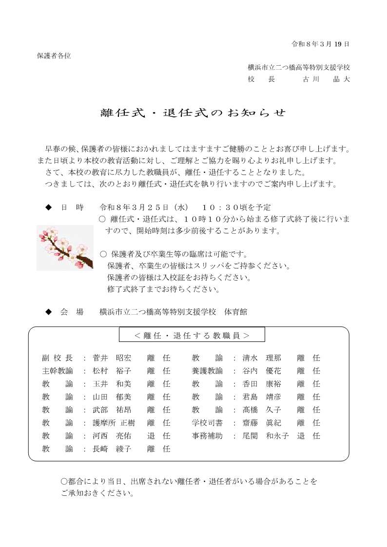 本校では、令和7年度をもって離任・退任される教職員をお送りする離退任式を下記のとおり挙行いたします。