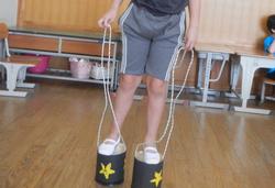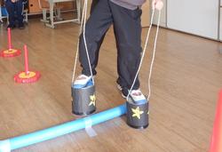 生活の遊びで、缶ポックリに挑戦しています。はじめはバランスがとれず、前に進むことも難しい様子でしたが、繰り返し練習したことで、少しずつ進める児童が増えてきました。ちょっとした障害物であれば、しっかりと足を上げて、またぐこともできるようになってきました。