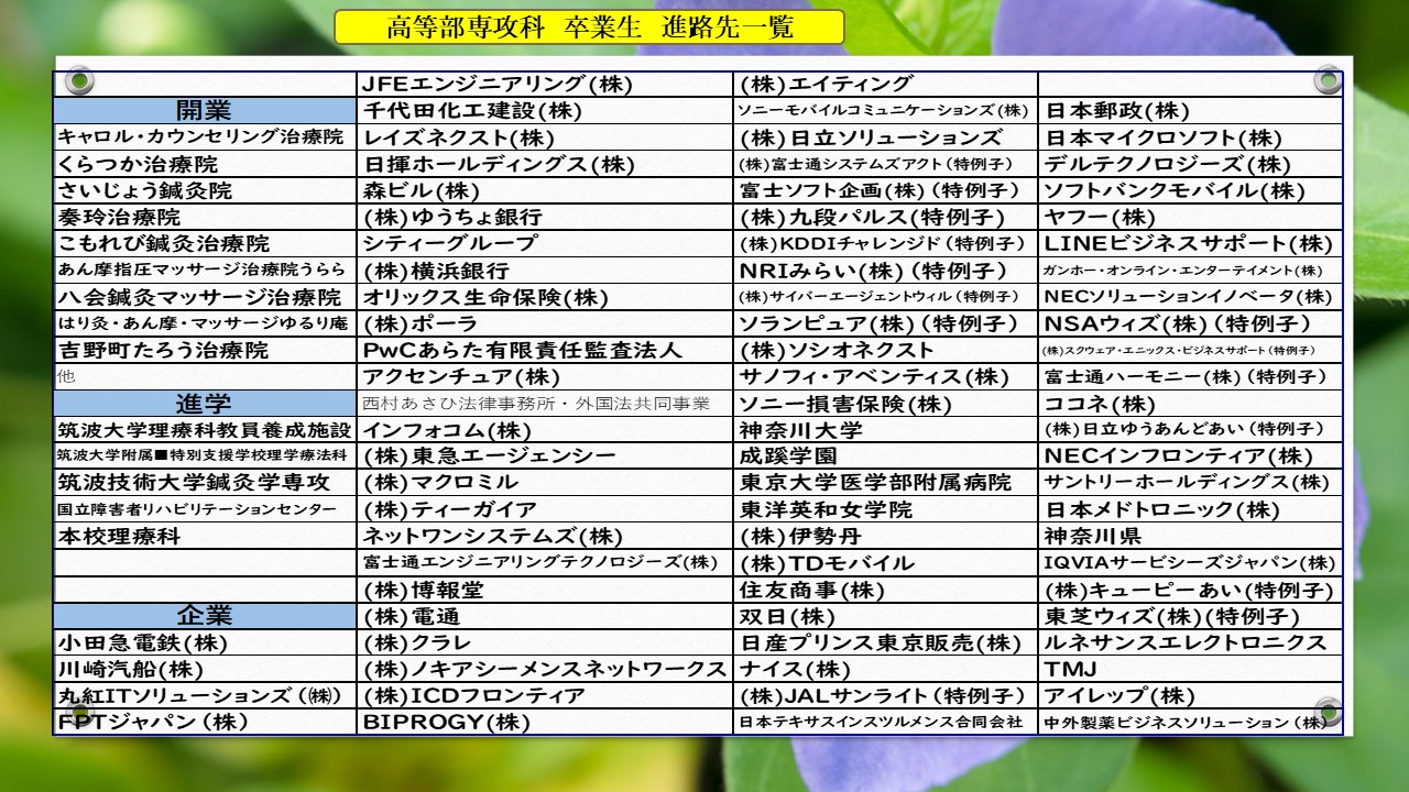 地域の医療スタッフとして疾病の予防や様々な疾患を抱えている人・スポーツでの傷害・疲労などに対してあん摩マッサージ指圧、はり、きゅう施術によって体調の改善やリラクゼーションをはかり地域の方々の健康を基盤にウェルネスに貢献しています。